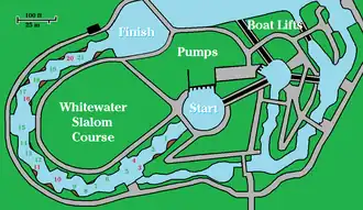 Powered by electric pumps, the slalom course is located at the southwest corner of the long rectangular rowing pond, from which it draws its water. Its western loop is the competition course; the eastern loop, with branches, is for training and warmup. Conveyor-belt boat lifts carry paddlers to the start pool.