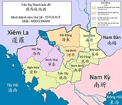 In November 1835, at the suggestion of Trương Minh Giảng, Emperor Minh Mạng created the Trấn Tây Province (鎮西) or Western Commandery over Cambodia, bringing Cambodia under direct Vietnamese rule and dividing Cambodia into thirty-three phủ or districts. Minh Mạng also appointed Trương Minh Giảng as Trấn Tây tướng quân (鎮西將軍, called Ong Tien Kun) as supreme Governor-General of Cambodia. As the Banteay Keav citadel of Phnom Penh, royal residence of Ang Chan, was destroyed by the invading Siamese in 1834, the Vietnamese built a new citadel called Trấn Tây in Phnom Penh to serve as the center of Vietnamese administration in Cambodia.[17] However, Queen Ang Mey and her sisters stayed at the Po Preah Bat palace, the last residence of their father, at Slaket opposite of Phnom Penh on the river. Trấn Tây Cambodia had regional centers; Kampong Thom or Hải Đông (海東) to the east of Tonle Sap Lake, bordering the Siamese-controlled Siemreap and Pursat or Hải Tây (海西) to the southwest of Tonle Sap, bordering the Siam-controlled Battambang.