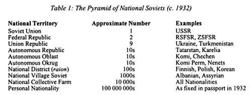 National-territorial units were expanded into smaller and smaller units called national soviets. The structure resembled a pyramid, with the number of units growing until reaching the bottom layer, the individual, with a fixed national identity. Tens of thousands of national borders were drawn and re-drawn, forcing everyone to choose a national identity and a set territory corresponding to that identity. This caused a large amount of ethnic conflict. Minorities wanted national soviets, yet even after this division, often remained the minority in a national soviet belonging to another group. The majority of such a soviet did not look kindly on its minority and often actively tried to expel them, by any means possible.[4]