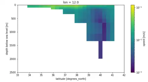 Cross section of the Strait of Sicily using the horizontal and vertical component of the current from the GODAS data file of 2020.[9]