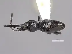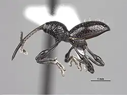 The antenna insertion point occurs at the middle in the rostrum in the female, and just beyond in the male. The rostrum is 1.00–1.08 times the length of the elytra in males, and 1.09–1.17 times in females.[1] The eyes occur at the rostrum's midlength, separated by about one half its width.[1] The globose prothorax is widest at the middle and characterized by very few large, deep punctures and erect setae scattered throughout.[1] The elytra have numerous erect setae, and the humeri are non-angulate and fully reduced.[1]