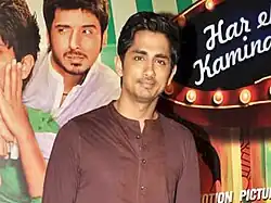 Siddharth then chose to produce his first film under his newly launched production studio, Etaki Entertainment Private Limited, which he had registered in October 2010. He financed the college romantic comedy Kadhalil Sodhappuvadhu Yeppadi (2012), based on the same-titled short film by Balaji Mohan, and featured in the lead role alongside Amala Paul. He revealed that after watching the 10-minute Tamil short film, he found it interesting and developed an interest to turn it into a mainstream full-length feature film. The film was shot over a period of eight months under a moderate budget. The film was partially reshot in Telugu as Love Failure.[59] The film opened in February 2012 in both languages to commercial success, becoming a profitable venture at the box office. Both the film and Siddharth won positive reviews, with a critic calling it "earnest" and "well-written".[60] In 2013, Siddharth had his most prolific year and appeared in seven film across four languages. Siddharth was selected to be a part of the ensemble cast for Deepa Mehta's Midnight's Children, a 2012 British-Canadian film adaptation of Salman Rushdie's 1981 novel of the same name. He sped read the book to prepare for his role and attended a series of workshops to portray the role of Shiva, earning positive reviews for his performance.[61][62] Siddharth then worked on Nandini Reddy's Telugu romantic comedy Jabardasth opposite Samantha, with the pair portraying wedding planners. Despite hype prior to release, as a result of the pair's off-screen relationship, the film garnered poor reviews with critics noting their characters "were poorly written".[63] The film became a commercial failure, while also becoming entangled in a legal tussle soon after release of story theft.[64] He also was subsequently seen in Srinu Vaitla's Baadshah, performing a guest appearance in a flashback sequence. His fourth release was David Dhawan's Hindi comedy film Chashme Baddoor, a remake of the 1981 film of the same name, which received negative reviews from critics.[65][66] Next, Siddharth collaborated with debutant director Manimaran for the romantic thriller Udhayam NH4, written by Vetrimaaran. The film won positive reviews and performed strongly at the box office, with a critic from Rediff.com adding the actor "has given a very mature, yet understated performance".[67] He then featured in Sundar C's commercially successful Tamil comedy film Theeya Velai Seiyyanum Kumaru portraying a timid IT employee who seeks the help of a love guru.[68] His popularity in Telugu cinema meant that the makers partially reshot the film in Telugu as Something Something.[69]