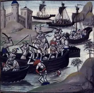 Under the command of his cousin, Tancred of Lecce,[8] William II sent out a fleet of 280 ships, 30,000 soldiers, and 1,500 knights.[9][10][11] On July 28, they arrived in Alexandria. The garrison was caught completely off guard. The Normans began to attack the city walls with siege towers, mangonels, and catapults, and the defenders were forced to repel the attack until nightfall. The following day, the Normans moved their siege artillery closer to the city walls and continued the attack, but the defenders were able to repel it thanks to reinforcements from nearby villages.[12]