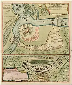 On the advice of one of his generals, Eugene chose to cross the Danube, approaching Belgrade from the east and rear, surprising the Ottomans who did not expect the enemy to cross the river at that point. He established the first camp at Višnjica the highest point, some 5 km (3.1 mi) away from Belgrade. On 18 June the city was surrounded.[16] Eugene deployed his artillery while the Imperial troops began digging trenches, in a semicircle from the Danube to the Sava, both in front of the fortress and at the rear to cover the imperials in the event of the arrival of a Turkish relief army. The fortification lines, 16 km (9.9 mi) long, were completed on 9 July providing a connection between Danube and Sava rivers. The right side of the camp was protected by the Habsburg Danube flotilla. Count von Hauben was sent to establish a bridgehead west of the Sava in order to have a supply and communication route to Petrovaradin and a liaison to Zemun troops.[17]
