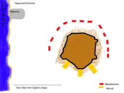 Upon arriving, Alexander camped near the southern side of the city and deemed the southern walls as the weakest.[7] It is alleged that the mounds were built quickly, despite the engineers' belief they could not be completed due to the nature of Gaza's fortifications.[8]