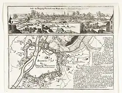 The first assault was delayed until July 21, and focused on the what was considered the weakest portion of the city defences, the Bossche Fronten near the Bosch Gate (see Map, I). During the attacks in late July and August, the Dutch forces suffered a thousand casualties, including Karel Florentine, lieutenant general of the infantry, who died of wounds.[14] Meanwhile, the Marquis of Louvignies, commander of the Army of Flanders, focussed his attack on the southern defenses, near the village of Sint Pieter (see map, K).