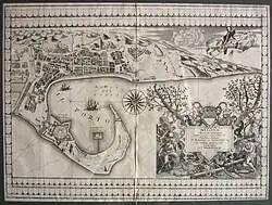 The port of Messina consists of a peninsula that starting from the southern end of the city turns north and then west in the shape of a sickle. At the starting point of this small peninsula, a massive fortress, known as the Citadel of Messina, formed by a pentagonal construction protected by deep moats and ramparts, had been built after Messina's great insurrection of 1674-78 against the Spaniards.[1] In addition, on the other end of the peninsula there was another, smaller fortress, Fort San Salvatore, flanked by Fort Real Basso, located in front on the city beach. This complex of fortifications entirely barred the entrance to the harbor. On the opposite side, the Citadel at the point where it connected with the mainland also had a fortified arsenal and another fort, Fort Don Blasco.