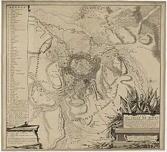 The siege of Mons took place between 19 September and 23 October 1709 during the War of the Spanish Succession.[6] It saw a Franco-Spanish garrison in the fortified town of Mons, then in the Spanish Netherlands, besieged by a force of the Duke of Marlborough's Grand Alliance army under the command of the Prince of Orange.[7]