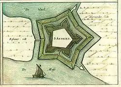Maurice laid siege to the fort in late January 1600 and set up a tight blockade on land as well as the nearby rivers. The garrison of San Andreas however refused all negotiations which Maurice used to induce those at Crevecoeur to surrender.[4] The garrison opposed the Anglo-Dutch in a vigorous and spirited defence for nearly six weeks whilst the besiegers fortified themselves around the dykes which they used to submerge the whole of the surrounding country.[11]