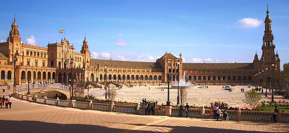 The Plaza de España, in Maria Luisa Park (Parque de Maria Luisa), was built by the architect Aníbal González for the 1929 Exposición Ibero-Americana. It is an outstanding example of Regionalist Revival Architecture, a bizarre and loftily conceived mixture of diverse historic styles, such as Art Deco and Neo-Mudéjar and lavishly ornamented with typical glazed tiles.[3][4]