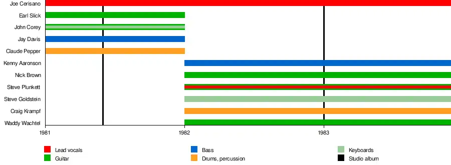The band's line-up shifted considerably between their first and second albums, with lead singer Joe Cerisano being the only constant member. The first incarnation of the band also featured the guitarist Earl Slick. The second album featured well-known bassist Kenny Aaronson as well as future Autograph frontman Steve Plunkett on rhythm guitar.