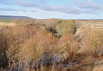 From its headwaters in the southern Blue Mountains, Silver Creek flows south through the Ochoco National Forest[6] and is fed by tributaries and, at the base of the mountains, large springs feed the creek.[7] The creek meanders through a broad alluvial plain[7] and turns southeast near Chickahominy Reservoir, traveling through the unincorporated community of Riley, where it is crossed by Highway 20 and Highway 395, respectively.[6] Past Riley Silver Creek flows through a canyon with 200-to-300-foot (60 to 90 m) tall walls made of volcanic basalt.[7] The creek is impounded several miles downstream, forming Moon Reservoir.[6] It then splits into two streams; one portion heads southwest into the usually dry Silver Lake, while the other portion flows southeast through Warm Springs Valley into the Malheur National Wildlife Refuge, and finally Harney Lake.[6][8]