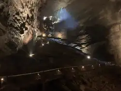 After Hugo's death in 1955, his wife, Mary, took over the day-to-day operations of the venture.[9][10] With the aid of her two sons, Jack and Peter, she was able to make vast improvements to the cave, including building a narrow-gauge funicular railway whose trains pulled visitors a distance of 218 feet (66 m) from the depths of the cave to the surface.[11]