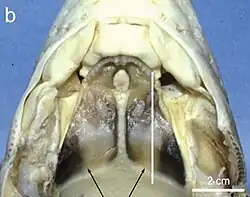 The tooth plates are unique organs, found only in holocephalans and lungfish. Silver chimaeras have three pairs: the vomerine and palatine pairs in the top jaw, and the lower pair in the bottom jaw. These tooth plates are used to crush the hard shells of the mollusks and crustaceans that silver chimaeras eat.[4]