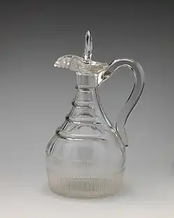 From about 1830 to 1920 the jugs became made of clear lead crystal glass capped with a lifting silver cover and usually also a silver handle. These are now very collectable. Most took advantage of the ease with which lead crystal can be cut. Less ornate versions were simply frosted. The silver mounted tops incorporated hinged lids, and handles that extended down halfway or to the base. The mounts were often engraved or chased, and the glass bodies were found in many different shapes and varying ornamentation. Some earlier examples were made entirely of silver. The level of craftsmanship and their aesthetic qualities determine their value. Unusual jugs, such as made by Charles Edwards or Christopher Dresser, or examples with fine engraved scenes may command high prices.