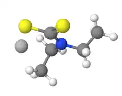 Silver diethyldithiocarbamate is a chemical compound, with formula AgS2CN(CH2CH3)2. It is the silver salt of diethyldithiocarbamic acid;[2] the latter is a well-known chelator of heavy metals. In most of its applications, silver diethyldithiocarbamate resembles the cheaper sodium diethyldithiocarbamate, but it is uniquely insoluble in water. That property makes it a useful analytical reagent for determining arsenic concentrations.