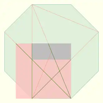 If the octagon has edge length its area is and the diagonals have lengths and The coordinates of the vertices are given by the 8 permutations of [15] The paper square has edge length and area The triangles have areas and the rectangles have areas