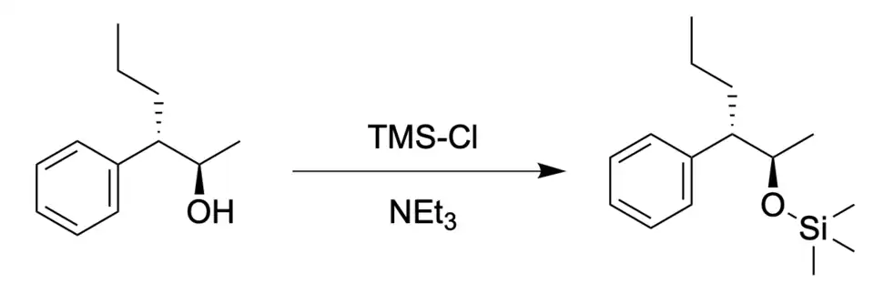 Silylation is often used to protect alcohols, as well as amines, carboxylic acids, and terminal alkynes. The products after silylation, namely silyl ethers and silyl amines, are resilient toward basic conditions.[2] Protection is typically done by reacting the functional group with a silyl halide by an SN2 reaction mechanism, typically in the presence of base.[3]