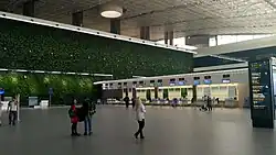This new terminal is 1 km west from the old terminal, between the main runway and the old one, making the eastern part of the airport useless. Eventually, the old runway (01R/19L) will be rebuilt and, with the runways being spaced >1 km apart, would be capable of parallel runway operations, like at Domodedovo, Berlin or Munich. The new terminal has 8 gates to air-bridges and 8 gates to apron buses, 16 escalators and 28 lifts, 55 check-in counters and the airport terminal is able to handle 6 million passenger annually.[17][18]