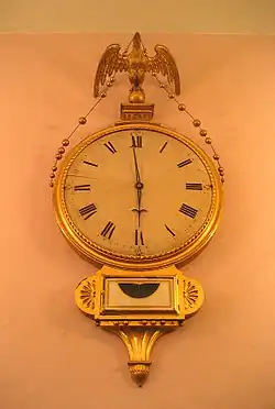 Minister Joseph Eckley and the congregation of Old South Meeting House in Boston, the site of planning for the Boston Tea Party, commissioned Willard to build a carved and gilded gallery clock to hang opposite the pulpit on the balustrade of the room's south gallery. The clock was capped with a spread eagle, carved in high relief and gilded, and measures 32" in height. The clock was delivered c. 1805, and remained within the meeting house until 1872, when the congregation moved to Old South Church in Boston's Back Bay. A replica has since replaced the original clock within the Old South Meeting House, now a museum on Boston's Freedom Trail.
