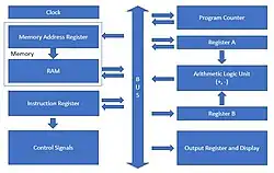 • An arithmetic logic unit (ALU) capable of adding and subtracting 8-bit 2's complement integers from registers A and B. This module also has a flags register with two possible flags (Z and C). Z stands for "zero," and is activated if the ALU outputs zero. C stands for "carry," and is activated if the ALU produces a carry-out bit.