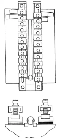 The track is positioned so that it is directly in the center of the inclined plane. Usually, the surface of the track is almost flush with the inclined plane's surface. The two permanent magnets are long bar magnets, polarized with their poles being at the long side, that are placed almost parallel to the track, but the poles nearest to the top of the inclined plane are closer to the track than they are at the bottom. The ball moves up the track because the magnetic field is stronger when the magnets are closer to the steel ball and each other, and since the net force is towards the top of the ramp, the motion of the ball is also that direction. This is why it is imperative that the magnets are constantly getting closer to the ball, in order to create a net force upwards. The track serves to keep the ball away from the magnets. If the track is not constructed carefully a slight imbalance can send the steel ball off the track into one of the magnets.