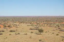 The Simpson Desert is an erg that contains the world's longest parallel sand dunes.[4] These north-south oriented dunes are static, held in position by vegetation. They vary in height from 3 m (9.8 ft) in the west to around 30 m (98 ft) on the eastern side. The largest dune, Nappanerica or Big Red, is 40 m (130 ft) in height.[5]