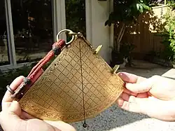 At the apex—where the two graduated straight sides of the grid pattern meet in a right angle—is a thin cord strung through a pin hole and weighted with a small bead. The cord is called a khait and is used as a plumb line when measuring celestial altitudes. It is also used to indicate angles when doing calculations with the instrument; the sliding bead facilitates trigonometric calculations. This plumb line serves two functions: first, it indicates the angular orientation of the instrument, and second, it ensures the instrument is parallel to the vertical plane (perpendicular with the ground) when optically aligned with the target.