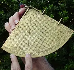 A sine quadrant (Arabic: الربع المجيب, romanized: rub‘ul mujayyab), sometimes known as a "sinecal quadrant", was a type of quadrant used by medieval Arabic astronomers. The instrument could be used to measure celestial angles, tell time, find directions, perform trigonometric computations, and determine the apparent positions of any celestial object for any time. The name is derived from the Arabic rub meaning 'a quarter' and mujayyab meaning 'marked with sine'.[1]