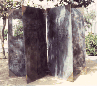 Banna was awarded a Grant under the Lef Foundation for her work the "Almanac Project", "San Francisco talks with different voices".[25][26] This outdoor site-specific installation was located in front of the San Francisco Library in Civic Center, San Francisco, California.[27] The work, a metal almanac with a seven-foot tall page, invited viewers and the public to put down their thoughts, in writing, on the artwork—thus constructing one large book of the voices of the San Francisco Community.[25]