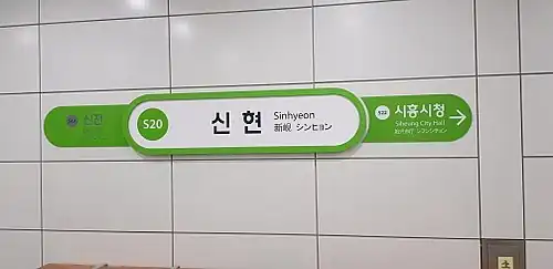 Sinhyeon station is a station on the Seohae Line in South Korea. It opened on June 16, 2018.[1][2][3]