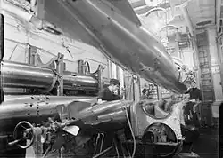 Norfolk was the first ship to sight Bismarck on the morning of 27 May. In poor visibility the cruiser stumbled upon an unidentified ship, flashing recognition signals before realising it was the German battleship. Norfolk quickly turned away and made contact with the British battleships before joining the final battle.[33] At 08:43, lookouts on King George V spotted Bismarck, some 25,000 yd (23,000 m) away; Rodney opened fire first at 08:47, followed quickly by King George V. Bismarck was unable to steer due to the torpedo damage to the rudders, and the consequent unpredictable motions made the ship an unstable gun platform and created a difficult gunnery problem. This was further complicated by the gale-force storm.[35] However, Bismarck returned fire at 08:50 with her forward guns, and with her second salvo, she straddled Rodney. This was the closest she came to scoring a hit on any British warship in the final engagement,[36] because at 09:02, a 16-inch (406 mm) salvo from Rodney struck the forward superstructure, damaging the bridge and main fire control director and killing most of the senior officers. The salvo also damaged the forward main battery turrets. The aft fire control station took over direction of the aft turrets, but after receiving three salvos was also neutralised. With both fire control stations out of action, Bismarck's shooting became increasingly erratic, allowing the British to close range. Norfolk and Dorsetshire closed and began firing with their 8 in (203 mm) guns.[37][38] Around 09:10, Norfolk fired four and Rodney fired six torpedoes from a distance of more than 10 km, but no hits were observed.[39]