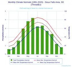 - ^ a b c d "Station: Sioux Falls, SD". U.S. Climate Normals 2020: U.S. Monthly Climate Normals (1991–2020). National Oceanic and Atmospheric Administration. Archived from the original on July 5, 2023. Retrieved October 14, 2021.