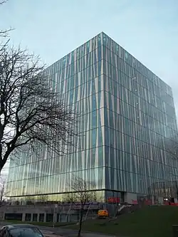 The building sits on a base of Scottish stone.[12][13] The ground floor is double-height with seven floors above. The building is clad in zebra-like jagged stripes of white and clear glass.[12][14] In the interior void spaces are located centrally.[1] Contrasting with the geometric exterior, the central atrium formed by the void spaces has an organic form, shifting in location across the levels.[15]