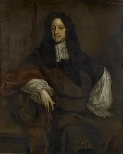 Dering married Mary Harvey, daughter of Daniel Harvey (a brother of Dr William Harvey) by Elizabeth, daughter of Henry Kynnersley on 5 April 1648.[3] They had 17 children, of whom 10 survived to adulthood. He was succeeded in his estates and title by his son Sir Edward Dering, 3rd Baronet. Among the other children, Elizabeth was married to Sir Robert Southwell, by whom she is ancestral to Camilla, Duchess of Cornwall;[4] Catherine to Sir John Perceval, 3rd Baronet, by whom she was the mother of John Perceval, 1st Earl of Egmont; Daniel, an Army officer, to Sir John's sister Helena Perceval; and Mary to Sir Thomas Knatchbull, 3rd Baronet.[5]