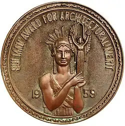 The medal design was completed in 1934 by Rayner Hoff (1894—1937), sculptor and teacher, well known for his architectural scaled sculptures in Sydney's Anzac Memorial in Hyde Park.[3] The circular bronze plaque has the text 'Sulman Award for Architectural Merit' on its perimeter, the year awarded, and a female figure holding a smaller winged female figure. The central figure is a stylised classical female in draped garments wearing a radiated headdress, reminiscent of classical depictions of deities or personifications such as Justice, Athena, or Liberty, symbolising cultural enlightenment, reason, and civic virtue. Her left arm cradles a sculptural figure, and her right hand gestures toward it, indicating reverence or presentation. The object she holds is a trophy or miniature statue, depicting a smaller winged or robed figure standing with arms raised. This smaller figure resembles traditional representations of Victory (Nike) or a muse, which often symbolise achievement, excellence, and inspiration.