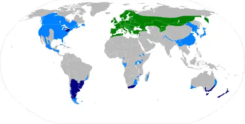 The species has reached other continents, such as Australia, South Africa and North America, through the export of timber and firewood. While invasion was prevented in North America for a long time, the European woodwasp established itself in New Zealand around 1900. There, it contributed to massive pine declines in the first half of the 20th century, spreading to Tasmania in the 1950s and then to the Australian mainland. Since 1980, it has reached pine plantations in Uruguay, and later also Argentina, Brazil and Chile; it was found in South Africa in 1994. The population increased in the Great Lakes area from 2004 on; the species had reached Vermont, New York, Pennsylvania, Ohio, and Michigan by 2009.[12][13] The woodwasps can swarm between 20–50 km (12–31 mi); it has been estimated it will take until about 2050 to spread to the far southeast of the USA at the current rate of spread.[14][15]
