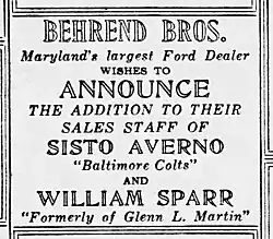 - ^ Cameron C. Snyder, "Pro Football in Baltimore is Fun, Says Sisto Averno," Baltimore Sun, Oct. 15, 1953, p. 28.
