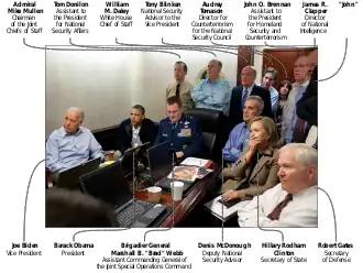 Air Force Brigadier General Brad Webb was sitting at the table monitoring the raid on Osama bin Laden's compound when Michael Leiter, then director of the United States National Counterterrorism Center, entered the room. Leiter does not appear in the photograph, but was followed by Robert Gates, Hillary Clinton, Joe Biden, and others. Soon the president entered the room, commenting "I need to watch this," and sat down next to General Webb. According to journalist Peter Bergen, the group was watching a live feed from an unmanned drone flying overhead. Leon Panetta said that Obama did not see bin Laden being killed.[2] Clinton said: "We could see or hear nothing when [the SEALs] went into the house. There was no communication or feedback coming so it was during that time period everyone was particularly focused on just trying to keep calm and keep prepared as to what would happen."[1]