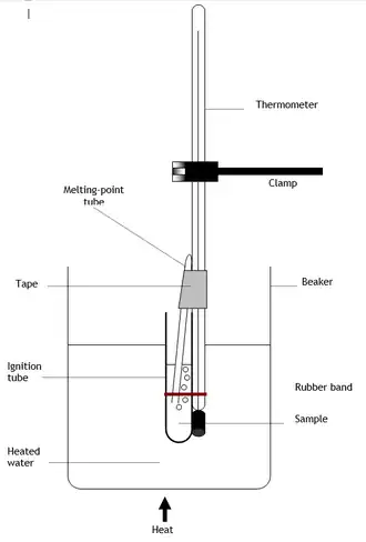 The Siwoloboff method is used to determine the boiling point of small samples of liquid chemicals. A sample in an ignition tube (also called a fusion tube) is attached to a thermometer with a rubber band, and immersed in a Thiele tube, water bath, or other suitable medium for heating. A sealed capillary, open end pointing down, is placed in the ignition tube.