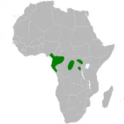 It is found from south-eastern Nigeria and western Cameroon to Central African Republic and extreme north-western Angola; central and eastern Democratic Republic of the Congo.[5] Its natural habitat is subtropical or tropical moist lowland forests.