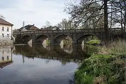 The river is bridged by three historic stone bridges. There is a four-arch inundation bridge in Mirovice, built in 1870–1876. Its original southern part has not been preserved, but it is still valued for its architectural and structural qualities.[5]