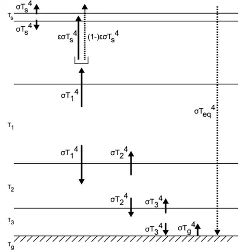 assuming the emission layer of the atmosphere radiates like a blackbody according to the Stefan-Boltzmann law. σ is the Stefan-Boltzmann constant.
