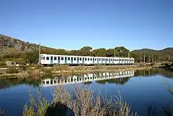 To operate the service 11 carriages were built by Comeng, Granville; with power bogies supplied by Swiss Locomotive and Machine Works and traction equipment by Brown, Boveri & Cie.[2] Each is 16.8 m (55 ft 1+3⁄8 in) long and 3.8 m (12 ft 5+5⁄8 in) wide, and can carry 225 passengers. This provides for the movement of around 4,500 people per hour.[4] Eleven passenger cars in total were built, 4 motor cars, 4 driving trailers and 3 non driving trailers. The motor cars each have four 301 kW (404 hp) traction motors, making them perhaps the most powerful rack railcars in the world. The braking system is mixed regenerative and rheostatic.[1] The train is capable of 40 km/h (25 mph), however this is limited during the downhill journey to 21 km/h (13 mph).