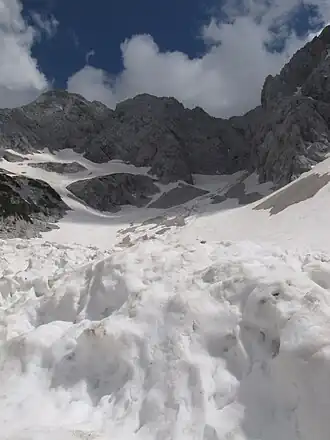 The Skuta Glacier lies in a north-western facing cirque—a bowl-shaped hollow carved into the limestone mountains—of the Kamnik–Savinja Alps in northern Slovenia. Sheltered by steep rock walls from direct sunlight for much of the year, it sits at an average elevation of 2,070 metres above sea level, and, as of 2020, covers only about 1.5 hectares, making it one of Slovenia's two remaining glaciers alongside the Triglav Glacier.[1] Skuta Glacier had an area of 2.8 hectares (6.9 acres) in 1950 and 1.7 hectares (4.2 acres) in 2013.[2] It is one of the lowest elevation glaciers in the Alps.[3]