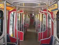 The original fleet consists of 12 metres (39 ft) lightweight Mark I ICTS cars from Urban Transportation Development Corporation, similar to those used by Line 3 Scarborough in Toronto (until its closure in July 2023) and the Detroit People Mover.[9] Mark I vehicles are composed of mated pairs and normally run as six-car trains, but can also be run in two- and four-car configurations. The maximum based on station platform lengths is a six-car configuration, totaling 72 metres (236 ft) The SkyTrain fleet currently includes 150 Mark I trains.[10] These trains have side-facing seats; red, white, and blue interiors; and two doors per car. However, some repainted units feature only blue and white interiors.