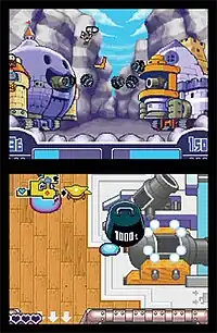 Attacking enemies is done by stretching the slime and then releasing, flinging it forward. The player can also hover temporarily in the air, and bury themselves in the ground while still moving.[15] Starting in the second title, players also engaged in battles using large tanks.[16]