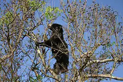 Adult sloth bears may travel in pairs. Males are often observed to be gentle with cubs. They may fight for food. They walk in a slow, shambling motion, with their feet being set down in a noisy, flapping motion. They are capable of galloping faster than running humans.[31] Although they appear slow and clumsy, both young and adult sloth bears are excellent climbers.[32] They occasionally will climb to feed and to rest, though not to escape enemies, as they prefer to stand their ground. Sloth bear mothers carry their cubs up trees as the primary defense against attacks by predators instead of sending them up trees. The cubs can be threatened by predators such as tigers, leopards, and other bears.[33] They are adequate climbers on more accessible trees but cannot climb as quickly or on as varied surfaces as can black bears due to the sloth species' more elongated claw structure. Given their smaller size and still shorter claws, sloth bear cubs probably climb more proficiently than adults (much as brown bear cubs can climb well but not adults).[24] They are good swimmers, and primarily enter water to play.[24]