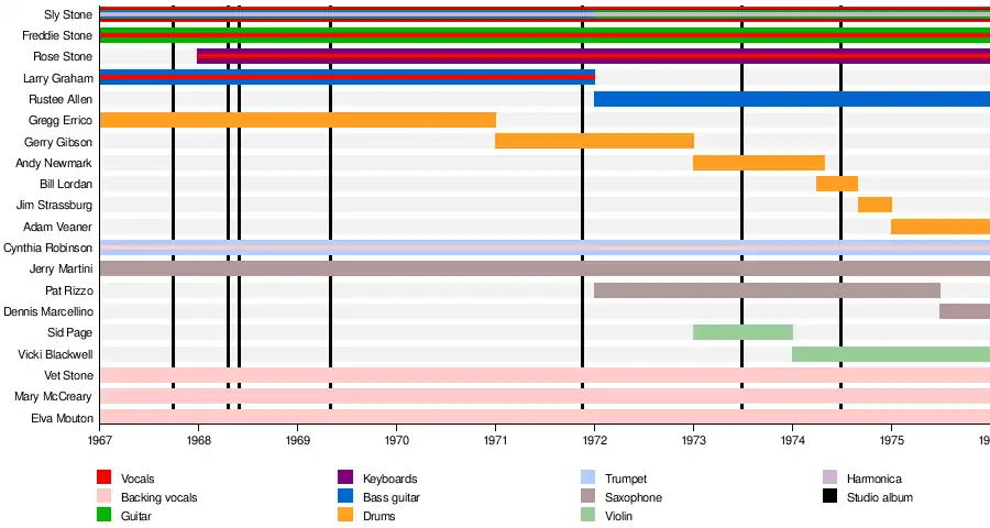 - Sly Stone (Sylvester Stewart) (1966–1975; died 2025): vocals, organ, guitar, bass guitar, piano, harmonica, and more