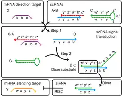 Fluorophore-labeled scRNAs have been engineered to transduce between detection of mRNA targets and generation of bright fluorescent amplification polymers in situ (Figure 1).[2] In this context, scRNA signal transduction enables multiplexed mapping of mRNA expression within intact vertebrate embryos (Figure 2).[2] scRNAs have been engineered to perform shape and sequence transduction to conditionally produce a Dicer substrate targeting 'silencing target' mRNA Y upon detection of an independent 'detection target' mRNA X, with subsequent Dicer processing yielding a small interfering RNA (siRNA) targeting mRNA Y for destruction (Figure 3).[1] In this context, scRNA signal transduction provides a step towards implementing conditional RNA interference (Figure 4).